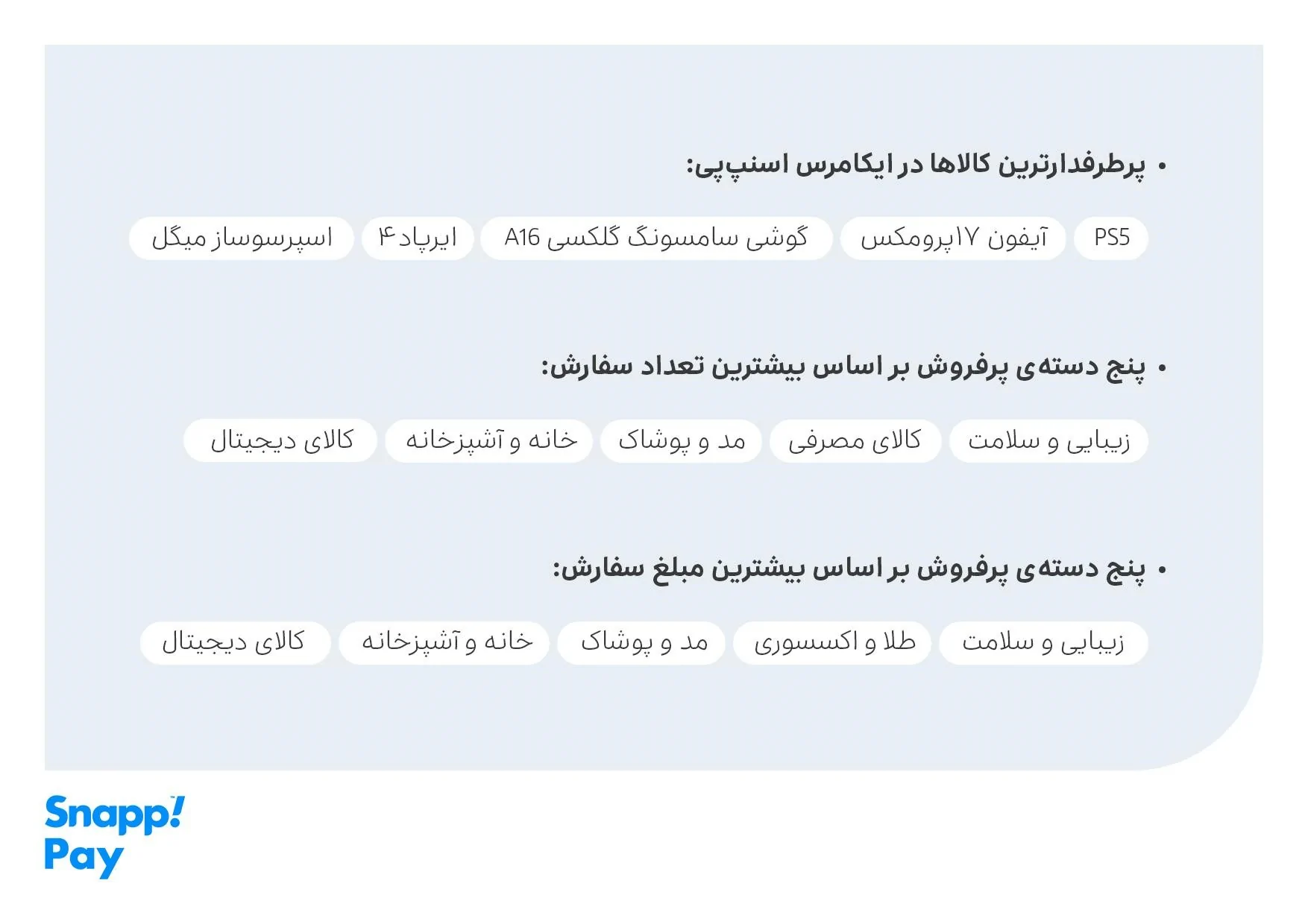 در رفتار خريد کاربران، تصوير روشنی از سبد خريد در اسنپپی شکل گرفت؛ محصولاتی مثل کنسول بازی PS5، آيفون ۱۷ پرومکس، گوشی سامسونگ گلکسی A16، ايرپاد ۴ و اسپرسوساز ميگل جزو پرطرفدارترين کالاها بودند. در دستهبندیها نيز پنج گروه «زيبايی و سلامت»، «کالای مصرفی»، «مد و پوشاک»، «خانه و آشپزخانه» و «کالای ديجيتال» بيشترين تعداد سفارش را به خود اختصاص دادند. بر اساس مبلغ سفارش هم پنج دسته «زيبايی و سلامت»، «طلا و اکسسوری»، «مد و پوشاک»، «خانه و آشپزخانه» و «کالای ديجيتال» در صدر قرار گرفتند؛ تصويری که نشان میدهد اعتبار اسنپپی هم برای مخارج روزمره و هم برای خريدهای گرانقيمت و دارايیهای بلندمدت استفاده شده است.
